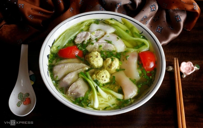 Nấu nước dùng và mọc: Xương ngâm nước muối rồi chần sơ, rửa sạch loại bỏ tạp chất. Ninh xương ở lửa nhỏ, mở vung cho nước dùng trong thanh. Có thể cho móng, thịt chân giò, lưỡi đã chần vào luộc cùng hoặc luộc riêng rồi lọc nước đấu vào thêm phần ngon ngọt tự nhiên. Sau khi ninh xương xong, lọc lấy nước trong, nêm nếm vị cho vừa miệng, một số nhà thêm nước cốt nghệ, một chút cà chua bổ múi cau để tăng màu sắc bắt mắt. Giò sống trộn với mộc nhĩ, nấm hương rồi vo viên thả vào nước dùng đang sôi nhẹ. Khi mọc nổi lên bề mặt là đã chín. Từ từ thêm bỗng rượu vào, chú ý vị chua cho vào cuối để bật vị và thoảng hương thơm đặc trưng. Trước khi ăn mới cho dọc mùng vào chần nhanh để thấm vị ngọt ngon từ nước dùng rồi vớt ra bát. Cũng có nhà đem chần riêng dọc mùng tuỳ chọn.