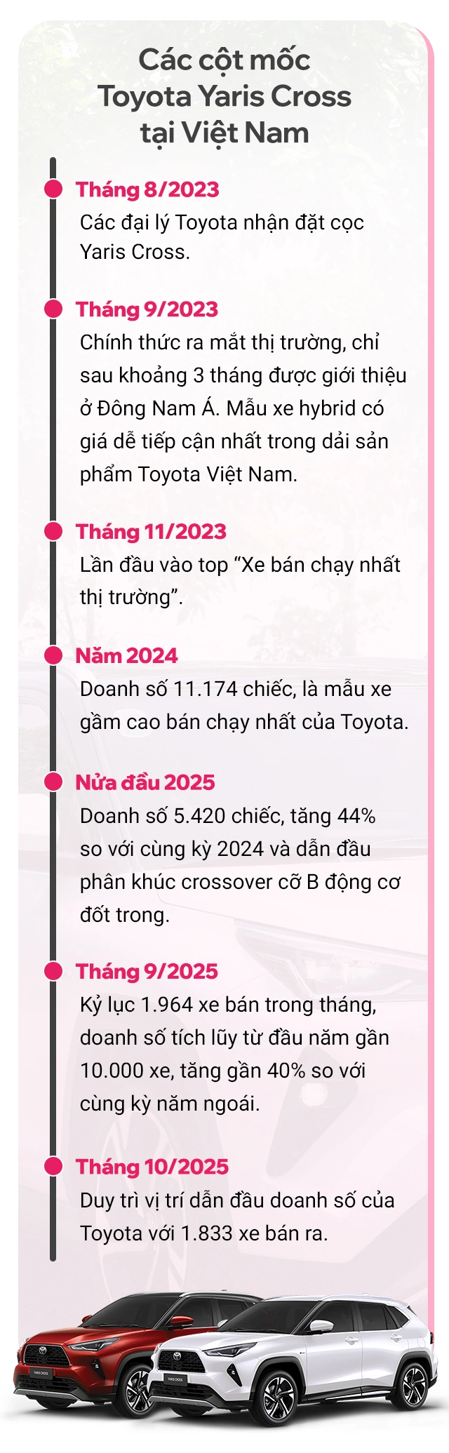 Với phiên bản HEV, Yaris Cross là mẫu hybrid có giá bán dễ tiếp cận nhất của Toyota tại thị trường Việt Nam, định vị phân khúc dưới Corolla Cross HEV. Hiện, Toyota là hãng có nhiều dòng xe hybrid nhất thị trường với 6 mẫu: Yaris Cross, Corolla Cross, Corolla Altis, Camry, Innova Cross và Alphard.