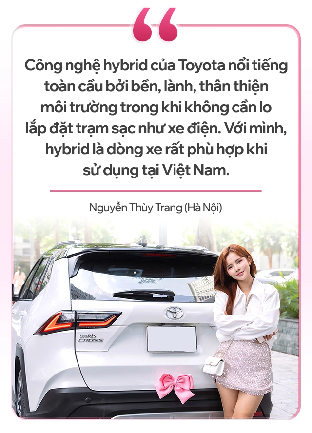 Nói về lý do chọn phiên bản HEV thay vì máy xăng truyền thống, Thùy Trang cho rằng đây là công nghệ mới ở Việt Nam, nhưng cách Toyota áp dụng lên xe rất dễ hiểu, dễ sử dụng, không khiến chủ xe phải thay đổi thói quen, không cần am hiểu về kỹ thuật.